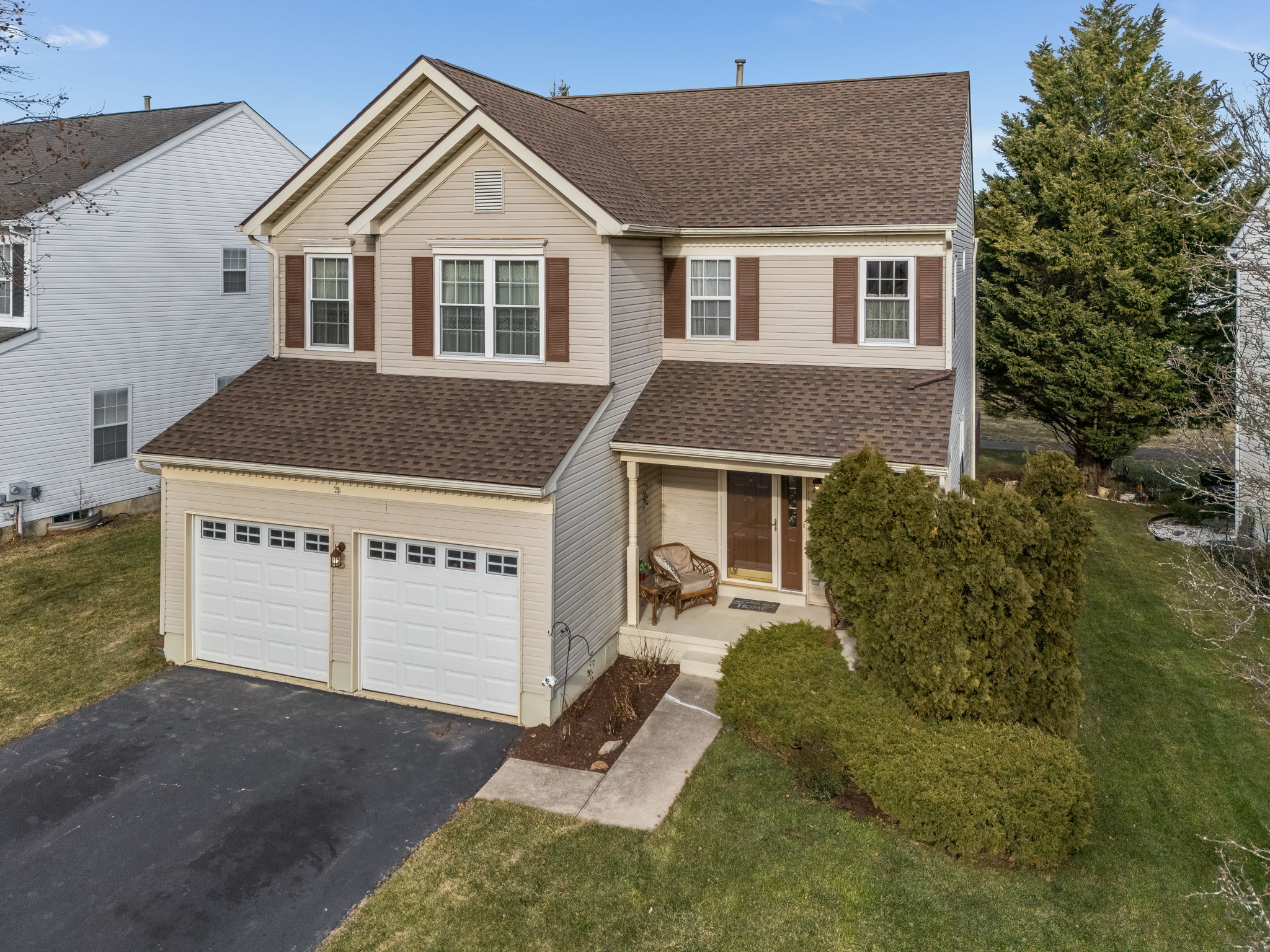 Super nice Colonial home in sought after Greenwich Chase. The 3 BR, 2.5 BA Hardwick model offers a huge Primary BR, Two story FR w/wood burning fireplace, and has a premium lot location across from open space and views off the back deck! Brand new Roof, 2024! New Shed, 2023. New hot water heater 2022. Large formal LR w/ wood floors open into Formal DR with New custom built in hutch w/glass, and tons of storage from custom cabinet company. Crown molding in LR/DR. Powder room on main. Updated EIK w/Granite counters, stone tile backsplash, and all appliances included. Breakfast nook w/skylight. Large deck, recently painted with views. First floor laundry w/washer & dryer included and extra cabinetry. Upper level offers a huge Primary bedroom 19 x 17, with 2 closets, and master bath w/soaking tub, separate glass shower, and updated double sink vanity, cultured marble sinks, and two updated mirrors and lighting. Another full bath, and two more bedrooms, plus loft area with balcony overlooking the FR. Very nice and workable floor plan with both open and formal living spaces. For more space there is a large unfinished basement. A must see home.